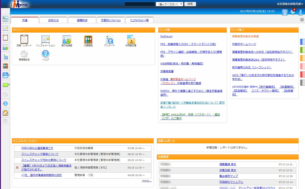 こうして同社は2016年初頭、本社と派遣添乗員との間の情報共有基盤をJ-MOTTOで構築する方針を決定した。その導入は極めてスムーズに運び、合間氏、牧野氏とも戸惑った作業は何一つなかったという。J-MOTTOは「スケジュール」や「ウェブメール」「ワークフロー」「ポータル」などをはじめ、全部で25種類の機能を備えるが、同社はスマートフォンからでも使いやすくなるように、「インフォメーション」「電子会議室」「文書管理」「ネオツイ」(社内SNS)などの8つの必須機能に絞ってシンプルなポータル画面を設計した。