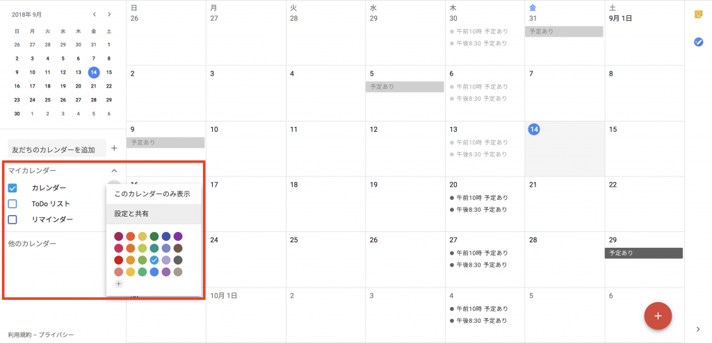 - 左部「マイカレンダー」の同期したいカレンダーのメニューを表示し、「カレンダー設定」を選択します。