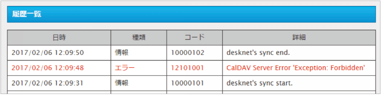 Googleカレンダーは他者のカレンダーを共有する機能がありますが、正常に同期させるためには変更権限が必要となります。変更権限がない場合は「CalDAV Server Error ‘Exception: Forbidden’」というエラーメッセージが履歴一覧画面へ出力されます。
