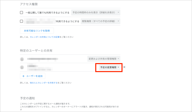 - もし「権限の設定」欄に「閲覧権限(すべての予定の詳細)」や「予定の時間枠のみを表示(詳細を非表示)」が設定されている場合は、設定を変更して「保存」ボタンを押してください。