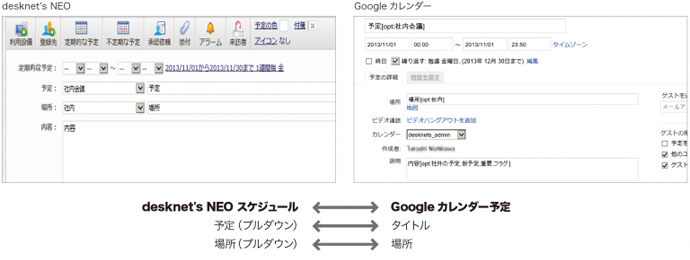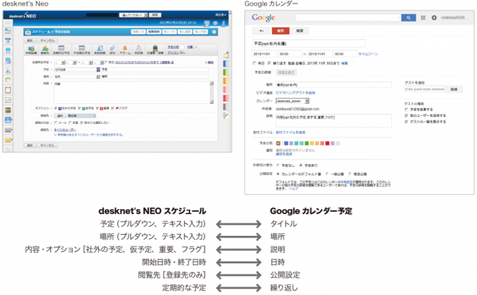 下記に示すdesknet's NEOスケジュール項目について、Googleカレンダー予定の対応する項目に[opt:(プルダウン内容)]という形で同期されます。