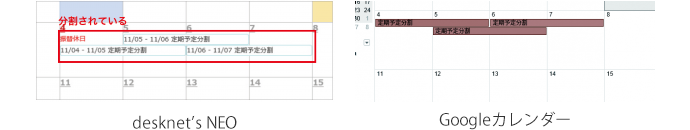 繰り返しの存在する予定のうち、Googleカレンダー側で登録されていた一部の定期予定やdesknet's NEO側で登録された不定期予定はdesknet's NEOスケジュールやGoogleカレンダーイベントとして登録される際、1回毎の予定単位で分割されて登録されます。