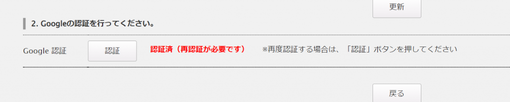 ※旧バージョン(v.2.25以前)でGoogle認証を実施している場合、「認証済(再認証が必要です)」というメッセージが表示されることがあります。この場合、今後スケジュールが同期できなくなる恐れがありますので、改めてGoogle認証を実施して最新の認証状態に更新するようにしてください。