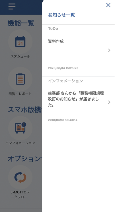 『J-MOTTOグループウェア』なら、新着のお知らせがプッシュ通知で受け取れます。
