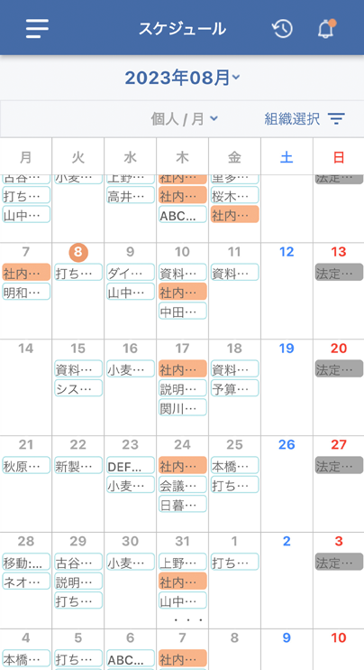 J-MOTTOグループウェアのスケジュールを表示・登録できます。これまでスマートフォン版で出来なかった「他メンバーの予定を並べて表示」することができるため、予定の空き状況を確認しながらスムーズに日程調整ができます。