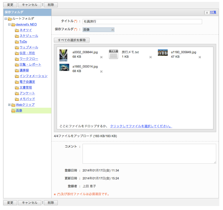 個人フォルダのように、データを自分用にストックして活用できます。文書や画像データを保存できるだけでなく、「回覧・レポート」「ワークフロー」の内容や、メールなど、他の機能にある情報も保存することができます。データを保管した特定のフォルダを、メンバーに共有することもできます。また、Webサイトの気になったページや役に立つページも丸ごと保管できます。