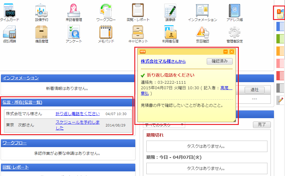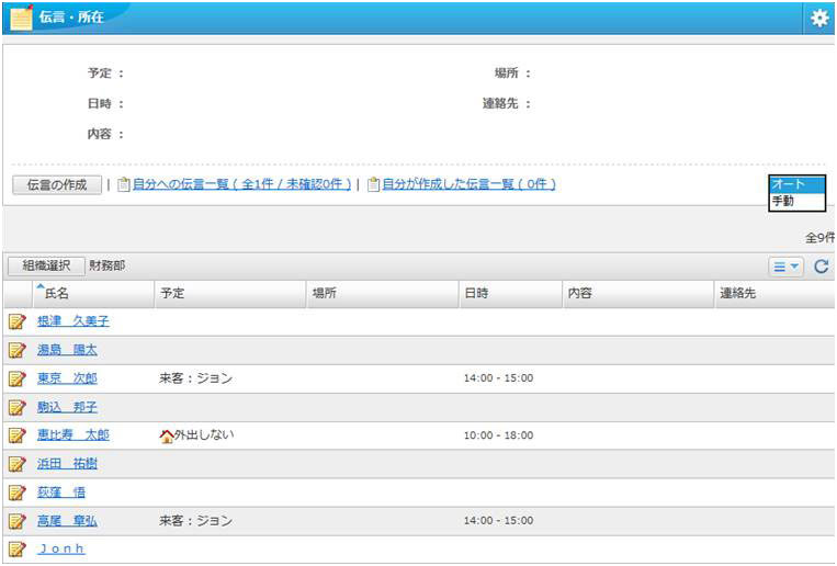 行き先や不在時の伝言を確認・登録できます。 外出中・離席中のメンバーの予定を確認し、担当者が不在の際は伝言を残すことができます。 スケジュール機能と連携させることにより、スケジュールに登録している内容を自動でさせることもできます。伝言を登録する際に、伝言内容をメールで通知することができます。