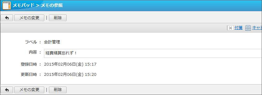 仕事の備忘録やアイデアなど、記録しておきたい情報を思いついたときに保存できます。メモは、自分専用のラベルを貼りつけて整理できます。また、付箋機能との連携により、どの画面からでもすぐにメモを記入でき、忘れないうちに記録を残せます。写真、資料などのファイル添付も可能です。
