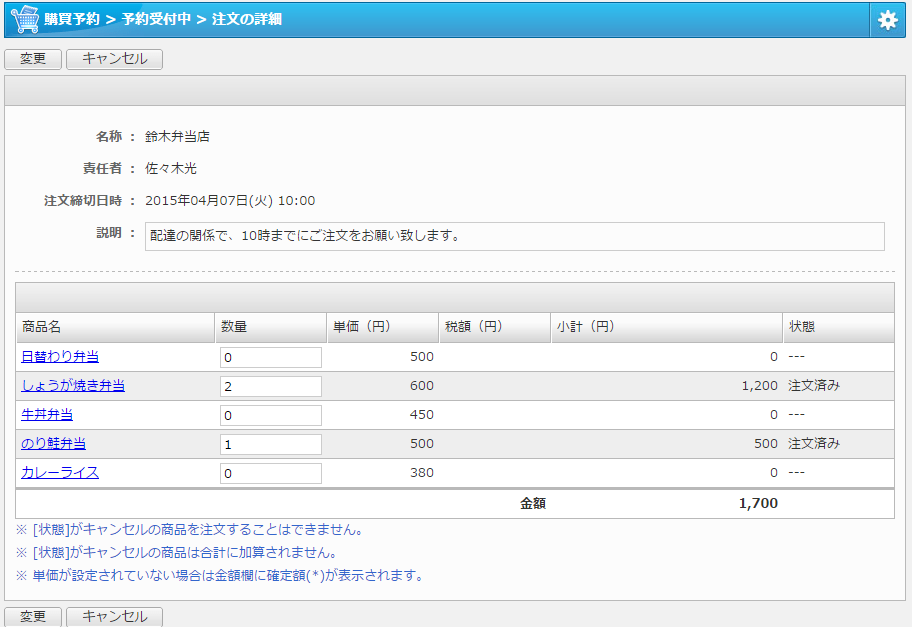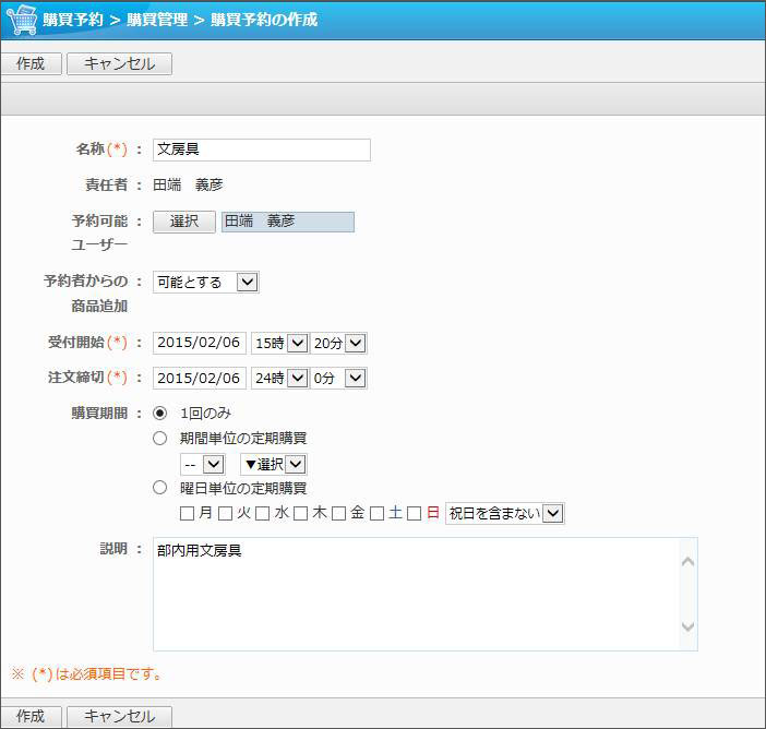 文具やお弁当の予約等、各種備品や購入物の注文を画面上で取りまとめ、会社全体の購買に活用できます。注文は品物単位で締切時間や定期購買の設定ができます。