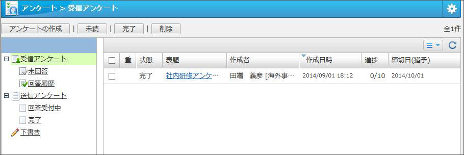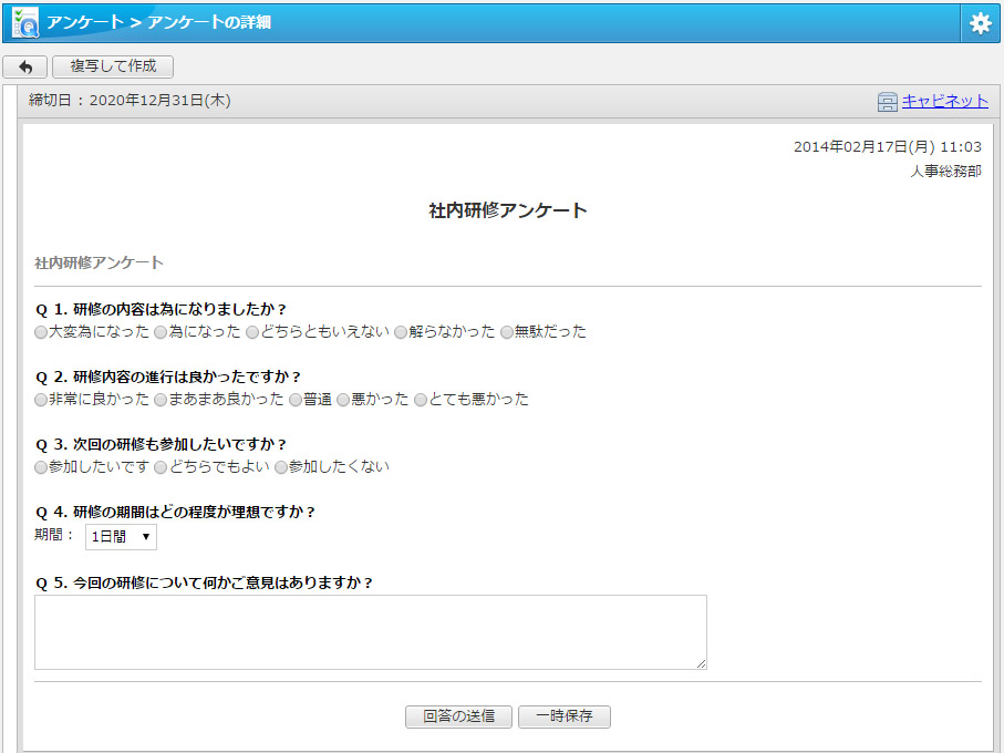 多くの人に同じ質問を出し、グループウェア上で回答を求めることができる機能です。 たとえば、アイデアの募集や社員の意識調査に活用でき、設問内容や回答方式を自由に設定することができます。 一覧画面から全員の回答を確認できるほか、送信時に他人の回答内容を閲覧可能か選択したり、回答者を特定できない匿名アンケートも行えます。回答内容をCSVファイルでダウンロードすることも可能です。