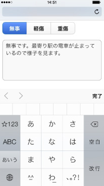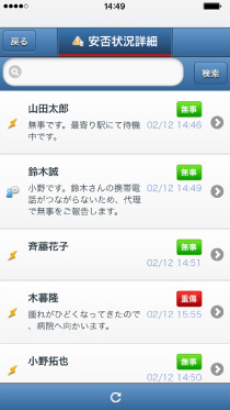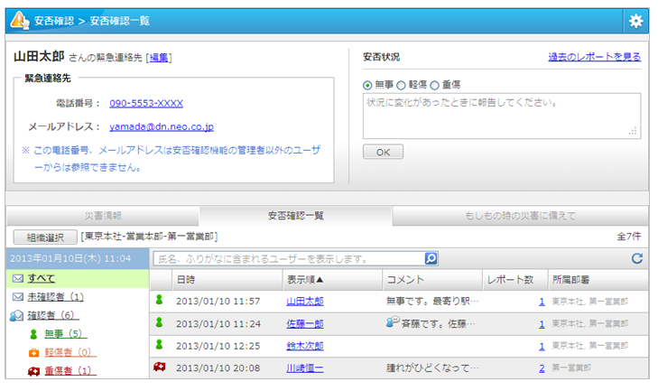 地震や台風などの自然災害やテロ、パンデミック等の緊急時や災害発生時に、地域や部署ごとに、安否確認のメールを一斉配信できます。メールを受信した従業員は、携帯電話、PC、スマートフォンから自分の状況を報告できます。他の従業員の状況を代理で報告することも可能です。 安否確認訓練や緊急連絡先の確認通知を行うこともできるため、有事を想定した事前の備えをサポートします。