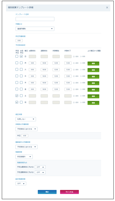 従業員ごとに就業に関する条件を設定できます。同じ条件の従業員が多い場合には、条件ごとのテンプレートを作成してテンプレートを適用したり、テンプレートを基に個人ごとのカスタマイズをすることができます。