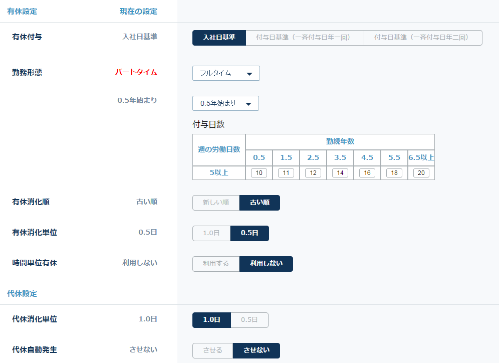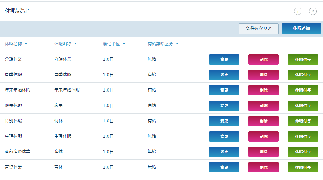 また、代休や介護休業などの他、会社独自の休暇設定にも対応しています。