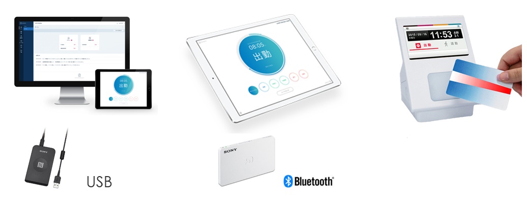PC、タブレット、スマートフォンで打刻できます。お手持ちの定期券やセキュリティカード等のICカードの情報をご登録いただき、打刻カードとしてお使いいただけます。スマートフォンのGPS情報を使った位置情報の記録も可能です。
