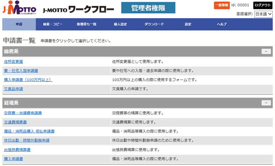 申請書を新規作成する際、申請書名を選択すれば、申請書式も承認フローも自動的に選択されます。