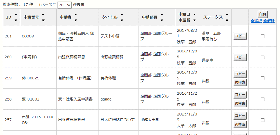 過去の申請書を様々な条件で検索することができます。