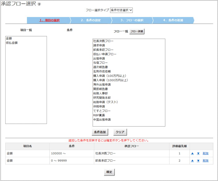 「金額が○円以上の場合は部長承認、○円未満の場合は課長承認」というような条件を、フローを選択して申請書に設定することができます。