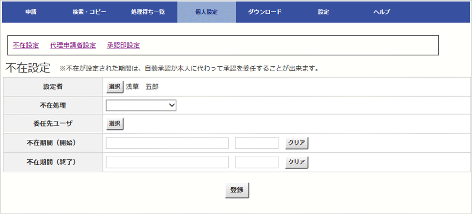 また、運用管理者が、不在となる本人の代わりに不在設定をすることができます。