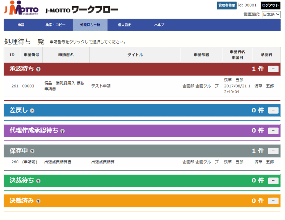 申請番号、申請者、申請日、申請者、件名、申請書などの条件で検索することができます。