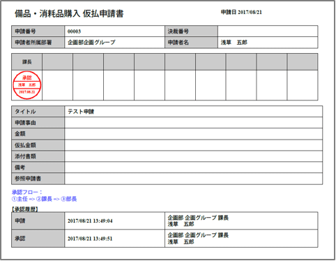 検索結果から印刷したい申請書をチェックして、一括でPDF出力・印刷することができます。PDF出力時のレイアウトは左図のようになります。