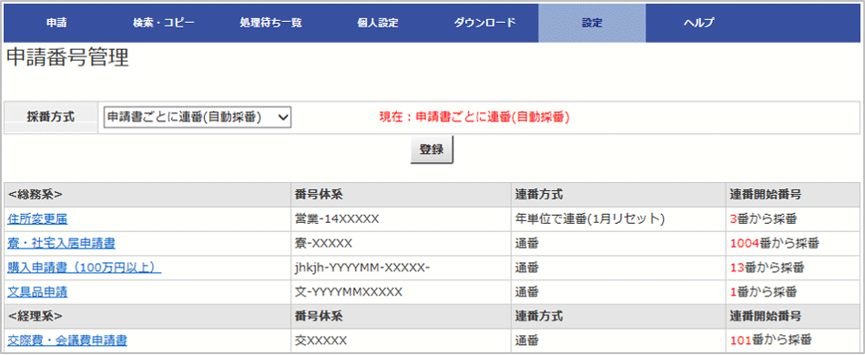 申請書の種類ごとの連番設定