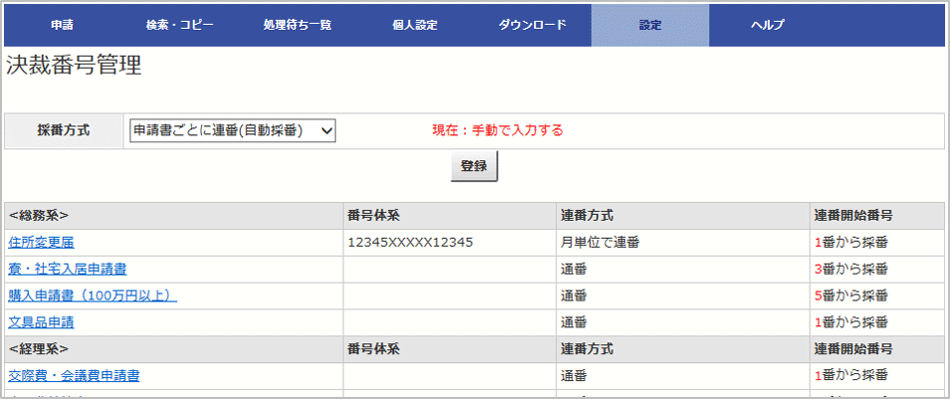 申請書番号、決裁番号を、申請書毎にそれぞれに連番設定することができます。